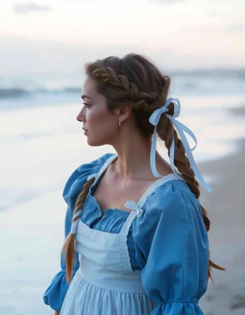 For a sweet milkmaid look, twist your hair into two braids and pin them to your head. Add glitter thread or satin ribbon to make it stand out.