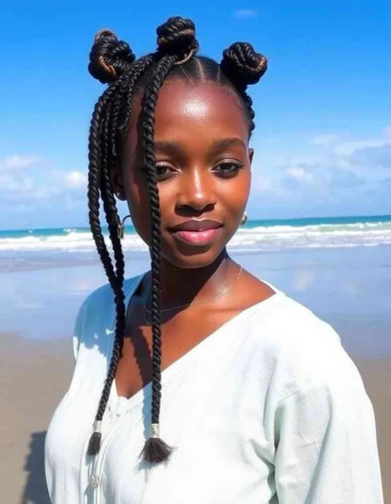A powerful, Afrocentric festival braid style can be created by combining Bantu knots with small accent braids. This combination keeps you cool and radiant while protecting your natural hair.